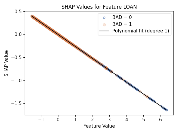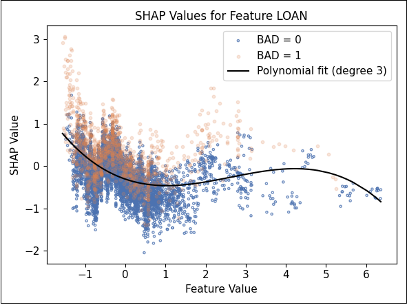 Beim Merkmal LOAN zeigt das Logit‑Modell eine erwartungsgemäß lineare SHAP‑Beziehung – in diesem Fall heißt das, niedrige beantragte Kreditsummen führen zu einem höheren Risiko (bzw. negativen Beitrag zum Score).