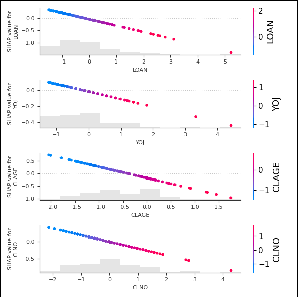 Abbildung 15: Vergleich der gleichlaufenden SHAP-Werte für ausgefallene Kredite aus Fold 1 im oberen linken Quadranten in Abbildung 7