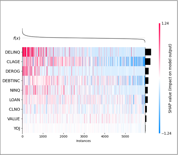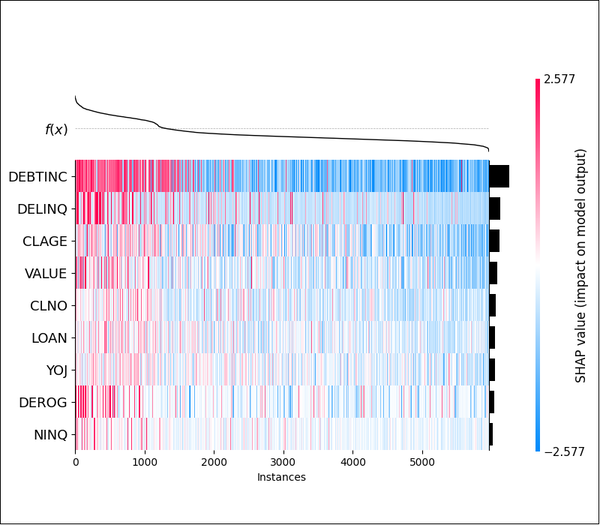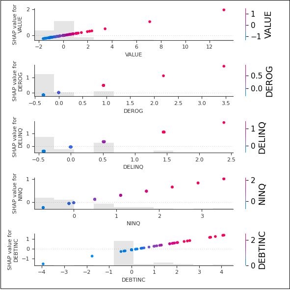 Im Gegensatz dazu zeigt Abbildung 15, dass die Modelle bei den Merkmalen VALUE, DEROG, DELINQ, NINQ und DEBTINC gleichlaufende SHAP-Werteeffekte aufweisen.