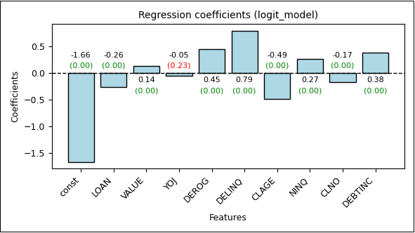 Abbildung 2: Regressionskoeffizienten des trainierten Logit-Modells (p-Werte in Klammern)