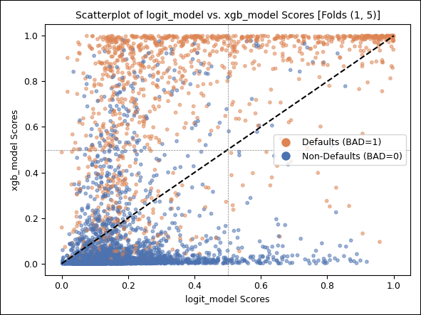 Ein zentrales Ziel der Validierung ist nicht nur die isolierte Bewertung einzelner Modelle, sondern insbesondere deren direkter Vergleich im Verhalten gegenüber identischen Kreditereignissen. Zur Visualisierung der Score‑Differenzen beider Modelle wird ein zweidimensionaler Scatterplot herangezogen, in dem die Score-Werte des Logit‑Modells gegen jene des XGBoost‑Modells aufgetragen werden. Jeder Punkt im Plot repräsentiert ein Kreditereignis, farblich differenziert nach Ausfallstatus.