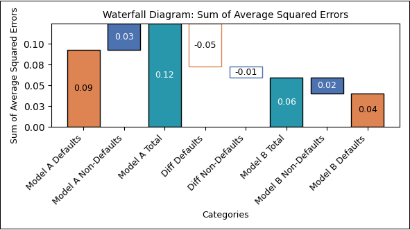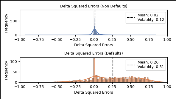 Eine ergänzende Darstellung in Form von Verteilungsplots visualisiert die Differenzen der Fehlerquadrate getrennt nach Ausfallstatus und macht sichtbar, dass der größte Teil der Modellabweichung durch falsch eingeschätzte Ausfälle im Logit-Modell verursacht wird.