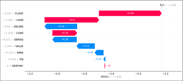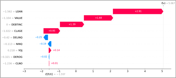 Die folgenden zwei Abbildungen zeigen beispielhaft die SHAP-Werte der beiden Modelle in Form eines Wasserfalldiagramms für einen ausgefallenen Kredit mit den Merkmalen x aus dem oberen linken Quadranten im Scatterplot (Abbildung 7).16